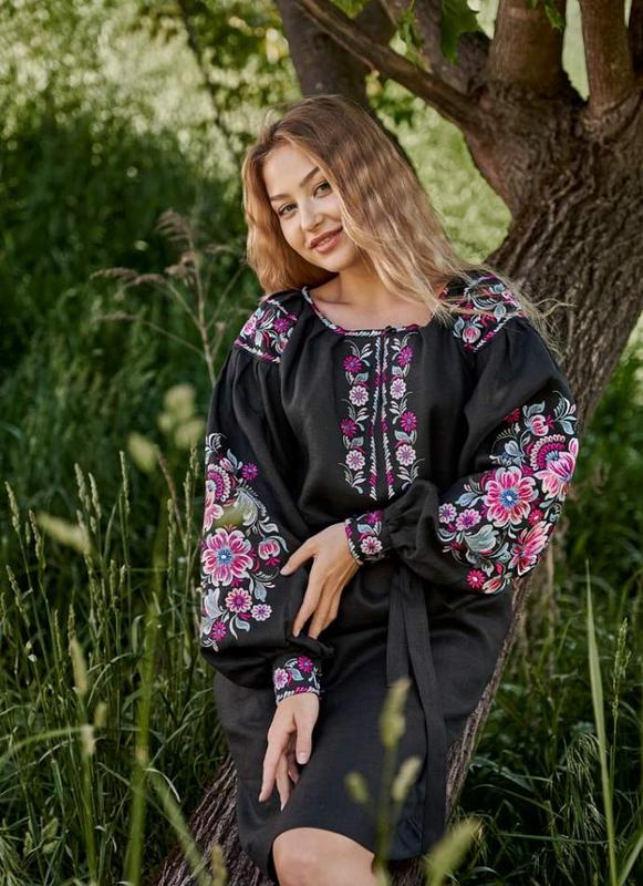 Чорне плаття з льону з квітковим узором, який прикрашає перед сукні, пишні рукава та поділ спідниці. Спинка однотонна, без виточок. Розріз спереду сукні застібається на гудзик. До плаття в комплекті є поясок з китичками, який вдало підкреслить талію.