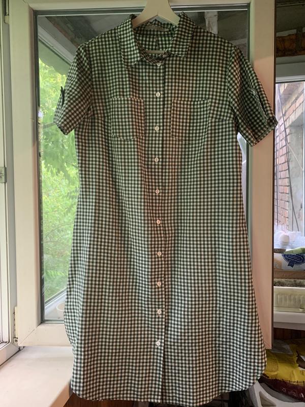 Сукня-сорочка в зелено-білу клітинку. 80% бавовна, 20% поліестер. Заміри: довжина виробу 104 см, напівобхват в грудях 50 см, напівобхват в талії 50 см., напівобхват стегон 54 см, довжина рукава 22 см. По низу на швах скругленні невеличкі розрізи. Стан нової речі. По додатковим питанням звертайтесь.