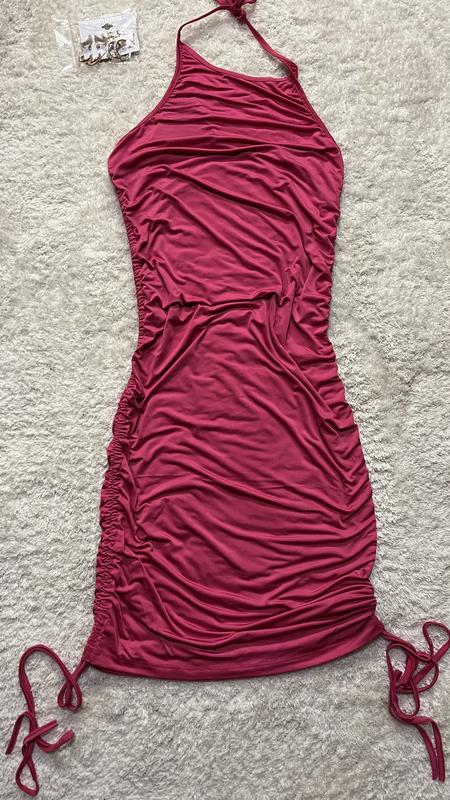Платье на стяжках, с помощью которых регулируется длина. На шее завязывается. Размер М. С биркой.