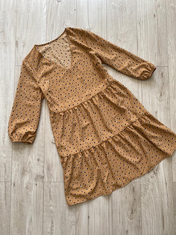 Красивое платье миди свободного кроя беж в принт 10 м Длина 86 Плечи 37 Рукав 3/4 низ резинка Полуобхват груди 49 Талии 46 Стегон свободно 62 Полиэстер