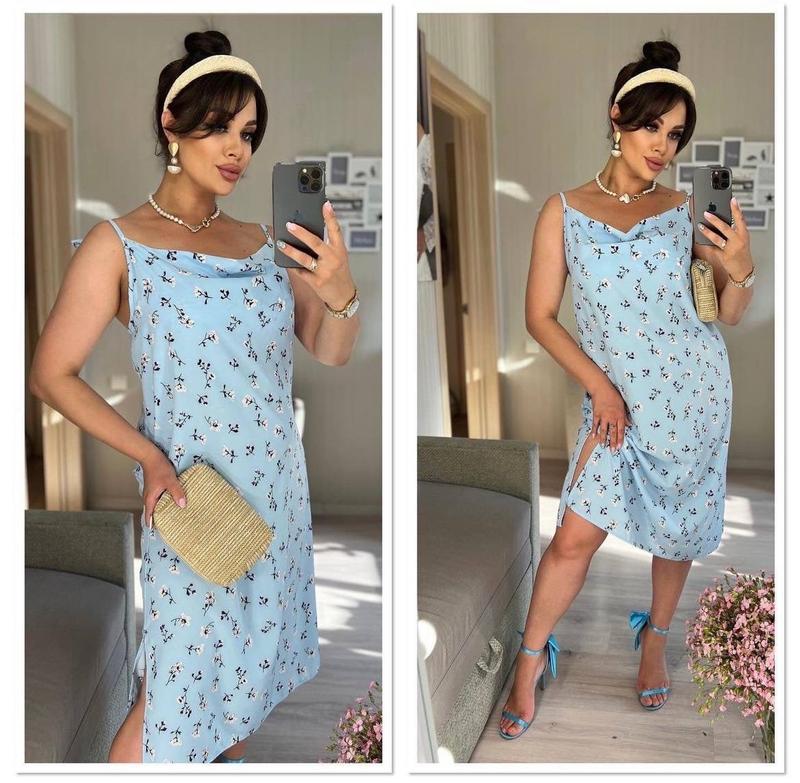 Розміри: 46-48, 50-52, 54-56 Тканина: софт принт Чудово підкреслює силует, гарно сідає по фігурі. Особливість моделі - провисання в області декольте і тонкі бретелі на зав’язках, які можна регулювати для зручності, два розрізи з боків надають неймовірної елегантності. Виміри: 46-48 об’єм грудей 104, об’єм стегон 112 50-52 об’єм грудей 112, об’єм стегон 122 54-56 об’єм грудей 120, об’єм стегон ад