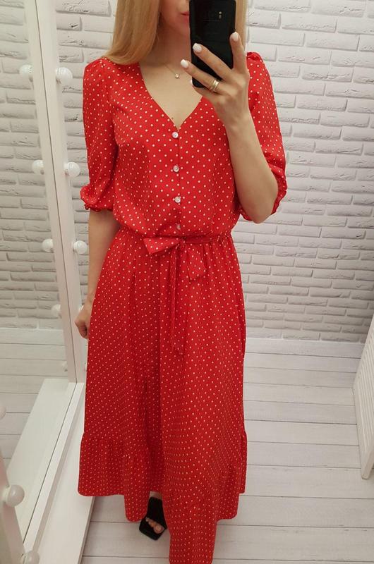 Легке плаття в горох від виробника - колекція 2021. Модний принт вільний крій універсальна довжина для літа. Тканина софт - легка, м'яка, комфортна, не мнеться і не вигоряє - швидко сохне, легко прати, не прозора. Рукав 3/4. Довжина міді. Довжина сукні 123см. Розміри 42, 44, 46, 48. розмір обхват грудей 42 92 44 96 46 100 48 104