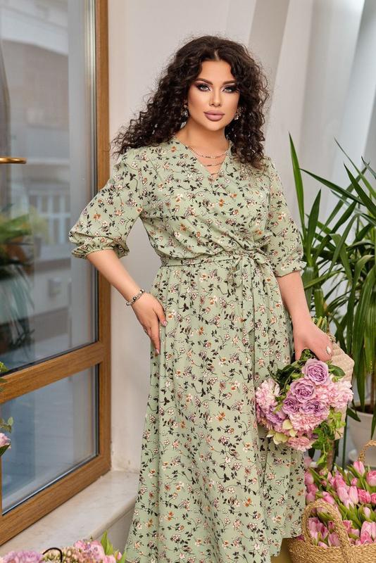 103 Новинка! Платье Модель 9100 Размеры: (48-50),(50-52), (52-54),(54-56) Ткань: Prada Цвета: голубой, фисташка, беж Замеры: Спинка/грудь запах /талия/длина/рукав/разрез (48-50)-44/62/28-52/133/43/42 (50-52)-46/66/28-52/134/44/42 (52-54)-48/70/28-52/134/45/42 (54-56)-50/74/28-52/134/45/42