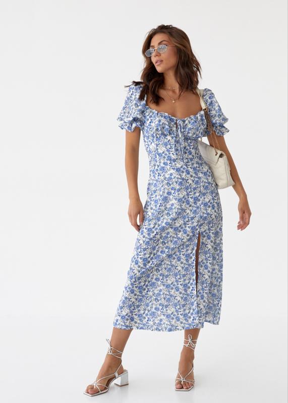 Ніжна розкішна сукня сарафан в блакитні троянди з розпіркою турція
