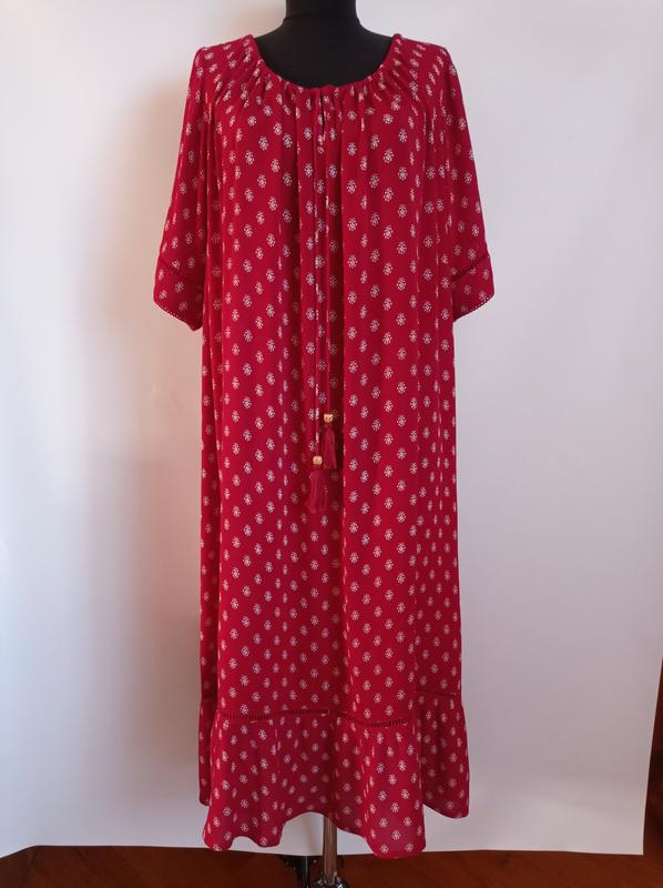Гарна сукня вільного крою, колір темніше ніж на фото (бордовий), стан ідеальний. Пог. 72, талії 74, бедер 78, рукав 30, довжина 112.
