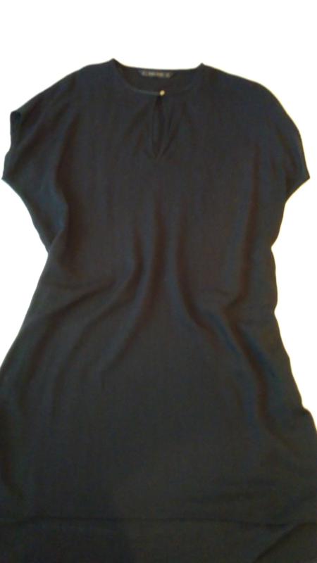 Фірмова туніка від ZARA. Легка,повітряна! Колір - насичений чорний. Спинка трохи довше,ніж перед. Розмір L (наш 48-50) ВИМІРИ: Плече + рукав - 23,5 см П/про під рукавами - 54см Довжина - від 83см до 92см Додаткова інформація - за запитом.