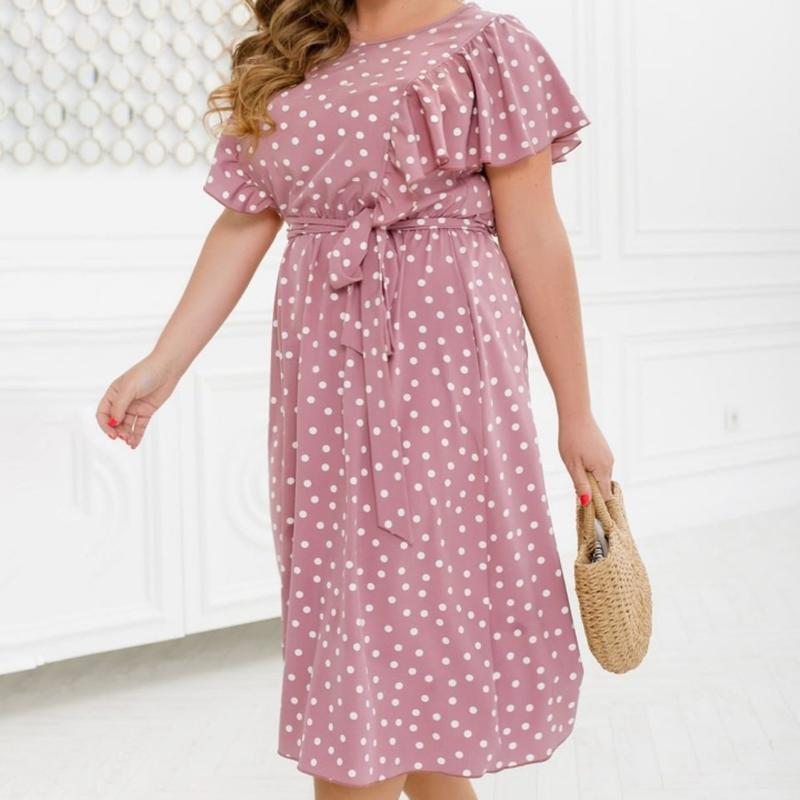 Сукня в горошок із софту. Виріб із рюшами спереду. Відрізна талія з еластичною гумкою. Доповнено поясом із основного матеріалу. Розмір: 46-48,50-52,54-56, 58-60,62-64,66-68 Довжина: 117-122см скромно і стильно .