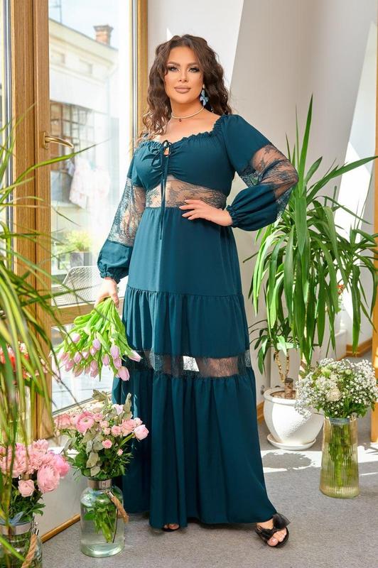 Арт 5685.11 Сукня Максі Матеріал: софт-шовк, вставки тонкого французького мережива. (Плаття можна моделювати: мотузочки, розташовані в районі грудей, можна зав'язати бантиком або зробити виріз декольте глибшим. Або зав'язати на шиї. ззаду шнурівка - регулює приталеність. Довжина виробу 142 см. Виміри: 42-46: ОГ 80-98см, ОТ 56- 82 см (ззаду шнурується і приталюється), ОС 82-110см 48-52: ОГ 98-106, ОТ 75-95, ПРО 104-120 54-58: ОГ 108-118, ОТ 80-110, ПРО 118-128 60-64: ОГ 120-13