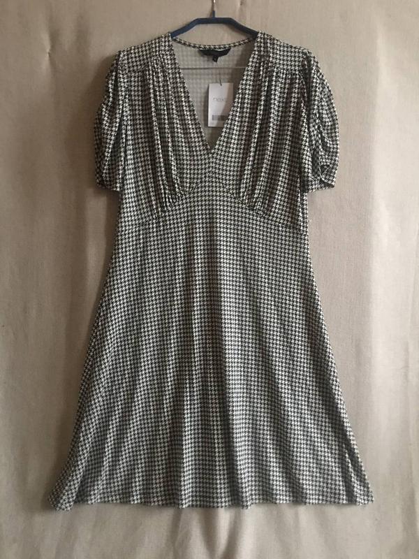 Класична чорно-сіра кольорова гама, Трикотаж тонкий, приємний, добре тягнеться і гарно драпірується Силует з розширенням до низу Актуальний крій з підрізом під лінією грудей Короткі рукавчатка по вертикалі призборені на резинку Платтячко чудово виглядає і на розмір L Довжина 100 см плечі 38-42 см, довжина рукава 30 см. ПОГ48-54 см, ПОТ 42-48 см, ПОБ 56 см, ПО низу 85 см
