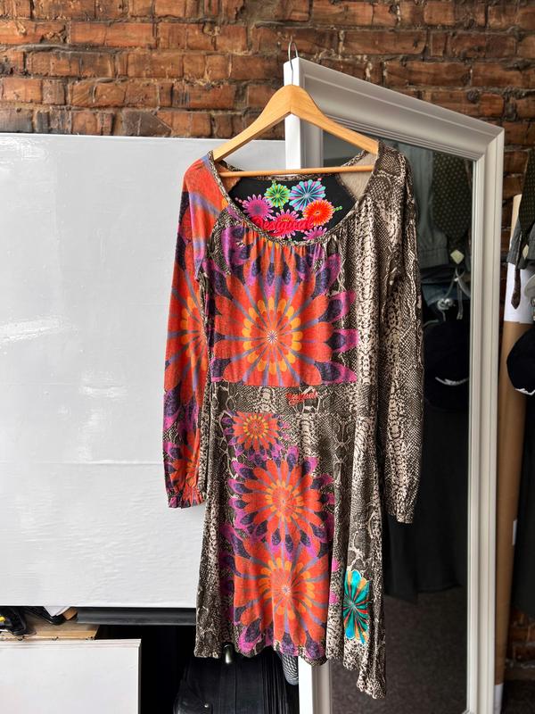 Desigual Women’s Multicolor Dress жіноча сукня, плаття ◾️Стан: 4.5/5 •відсутній пояс ◾️Розмір: L Заміри: •Довжина спереду від коміра - 84 см •Довжина по спині - 99 см •Довжина рукава від шиї - 73 см •Підмишки - 50 см •Вихід - 83 см