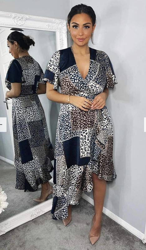Очень красивое темно-синее платье-миди с животным принтом в стиле печворк - идеальное платье для любого случая! Имеет топ и юбку с оборками, рукавами-бабочками, низким краем и молнией на спине. Просто соедините туфли на каблуке и клатч, чтобы завершить образ! размер L-XL(указанный 16) длина 109-145см, пог 56см,пот 41-50см