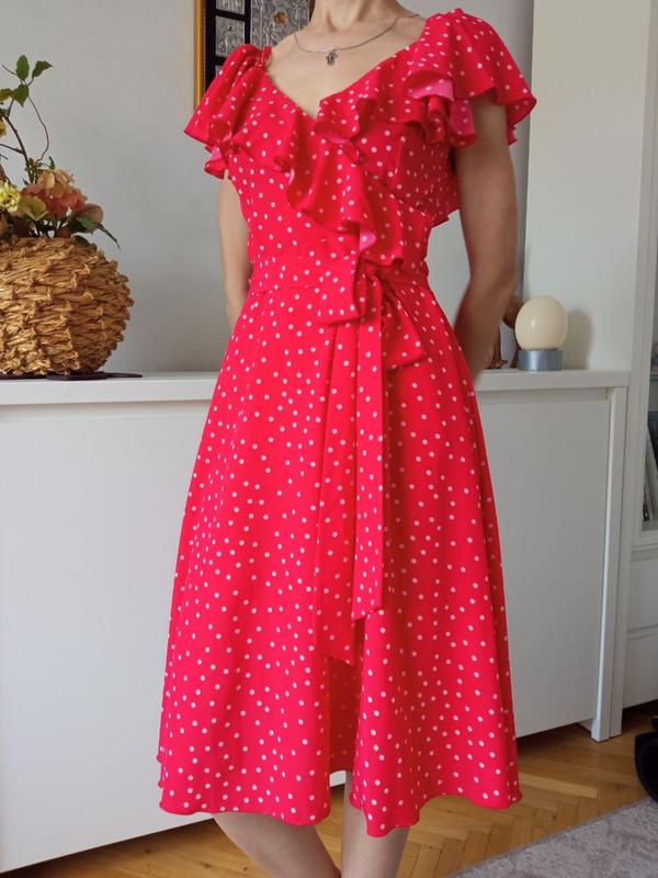 Чудова яскрава літня сукня, пот - 34, довжина (107 см). Пошиття в грудях на запах, тому підійде для дівчат з різним обхватом грудей. Колір яскравий червоний із білим горошком.