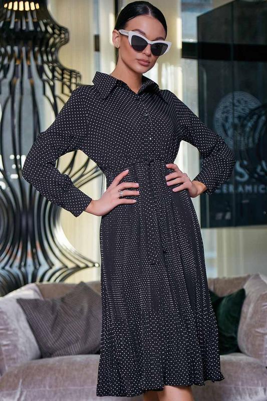 Нарядные женские платья от интернет-магазина ST-Seventeen, представленные в коллекции Style pleating, пополнят весенний и летний гардероб стильными обновками. Платье черного цвета из итальянского софта создаст романтический или элегантный классический образ благодаря длине ниже колена, юбке плиссе и воротнику рубашечного типа. Оригинально смотрится лента-завязка на воротнике и отрезная завышенная талия. Длинные втачные рукава заканчиваются манжетами. Платье пошито в свободном расклешенном фасоне. Съемный пояс подчеркивает линию талии.