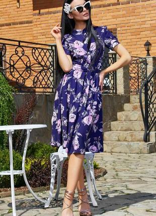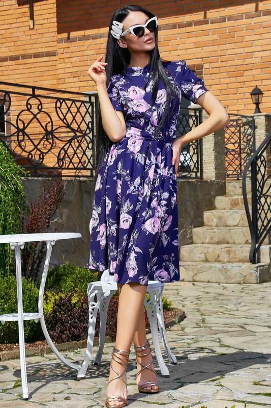 Нова літня колекція Lavanda в жіночному романтичному стилі поспішає потішити покупців інтернет-магазин ST-Seventeen модним вбранням синього кольору з красивим малюнком і троянд. Молодіжна модель має трапецієподібний фасон із пишною спідницею й елегантний комір-стійку. Плаття пошите з високоякісного принтованого софту. Короткі вшивні рукави закінчуються манжетами та мають оригінальну конструкцію за окатом. За планкою на пілочці розташовані невеликі ґудзики, а нагрудні виточки вигідно підкреслюють зону декольте. Для виділення лінії талії передбачений знімний пояс. Ексклюзивні плаття гуртом від виробника в цій моделі ідеально впишуться в гардероб вуличного, повсякденного, святкового, романтичного або гламурного стилів.