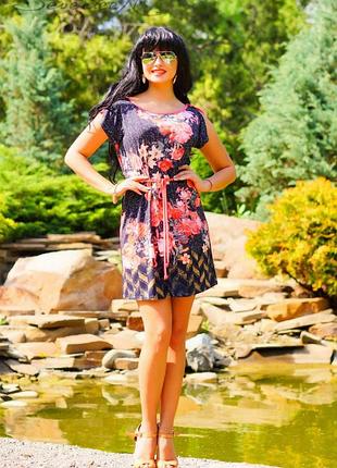 Будьте чарівною!Легке, ніжне плаття з геометричним орнаментом і яскравим квітковим принтом, припаде до душі кожній модниці. Адже в такому вбранні Ви не залишитеся непоміченою. Матеріал: мікроолія Довжина виробу: 79 см Колір: темно-синій з кораловим принтом