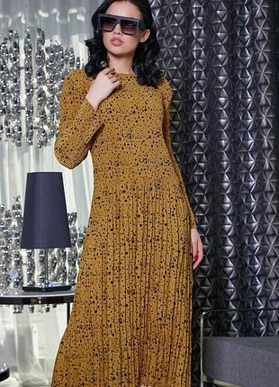 Інтернет-магазин ST-Seventeen презентує нову колекцію Style pleating, моделі якої призначені для весняного та літнього гардероба. На сайті плаття гуртом можна купити за найвигіднішою ціною, водночас з незмінно високою якістю й ексклюзивним оформленням. Ця модель допоможе створити напрочуд гарний і жіночний образ у повсякденному, міському або молодіжному стилі. Елегантне плаття гірчичного кольору має оригінальний вигляд завдяки принту в дрібний і великий горох. Воно пошите з високоякісного креп-шифону, тому гарантує комфорт і свободу рухів у будь-яких умовах. Модель має горловину-човник і довгі ушивні рукави. Фасон напівприталений, вільний, спинка та рукави задекировані за допомогою плісе.