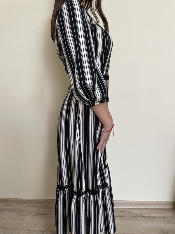 Сукня в полоску, розмір М, Довжина рукава від плеча-43 см Ширина плечей- 38 см Довжина сукні від плеча-116 см Талія 71 см максимум) Груду 90см ( є виточки може потягнутись ще на декілька см) Стена до 100 см ( сукня на стегнах вільного крою)
