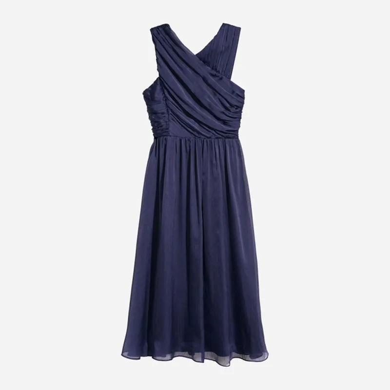 Плаття завдовжки до середини литки з жатої тканини. Вузький крій, зверху асиметричний. Захід і драпірування спереду на пілочці. Відрізна модель зі складкою на талії. Розкльошена спідниця, що спадає важкими складками. Потаємна блискавка ззаду. На підкладці.