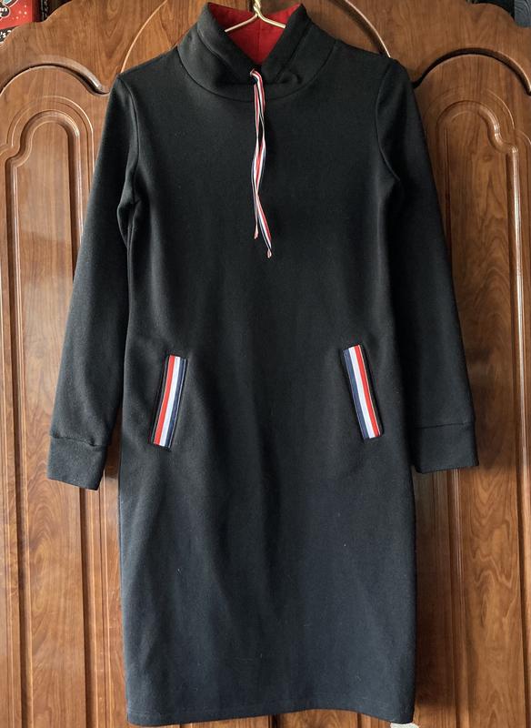 Тепла сукня в спортивному стилі. Наявний високий комір із шнурівкою. Спереду є дві кишені з декором з трибарвної стрічки. Приємна на дотик тканина. Матеріал: щільний трикотаж «тринитка» з флісом Довжина: 97 см