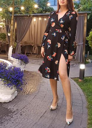 Гарна сукня в квітковий принт на запах. Тканина не мнеться, добре носитися. Стан ідеальний, без дефектів. За додатковими вимірами звертайтеся. Одягнене на ріст 168 см.