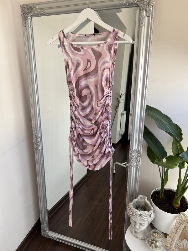 Напівпрозора сукня дуже приємного кольору. Довжина регулюється затяжками з двох сторін ПОГ: 42-48 ПОТ: 36 - 40 ПОС: 40 - 44 По бірці М, але вона досить універсальна, може бути і на менші розміри, як оверсайз, і на більші, так як гарно тягнеться