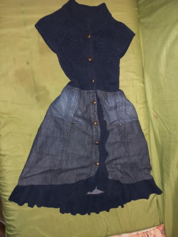 Платье 100% коттон. верх вязаный, низ джинс, спереди застегивается на пуговицы , сзади поясок.