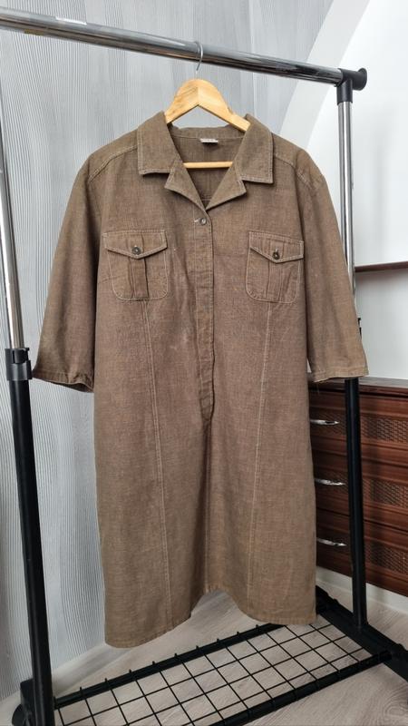 Сукня кольору хакі, виликого розміру. Матеріал цупкий і не тягнеться. Плечі 49см. Рукав 40см. ПОГ 63см. ПОТ 57см. ПОС 62см Довжина 96см. Зроблю додаткові фото чи заміри при потребі