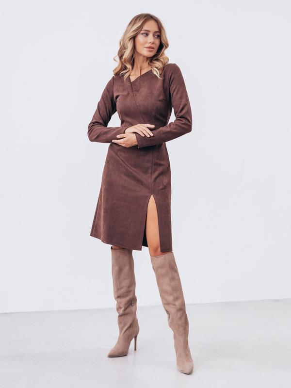 Приталенное платье из замши. Изделие с фигурным вырезом горловины. Дополнен разрезом по ноге. Застегивается на молнию по спинке.