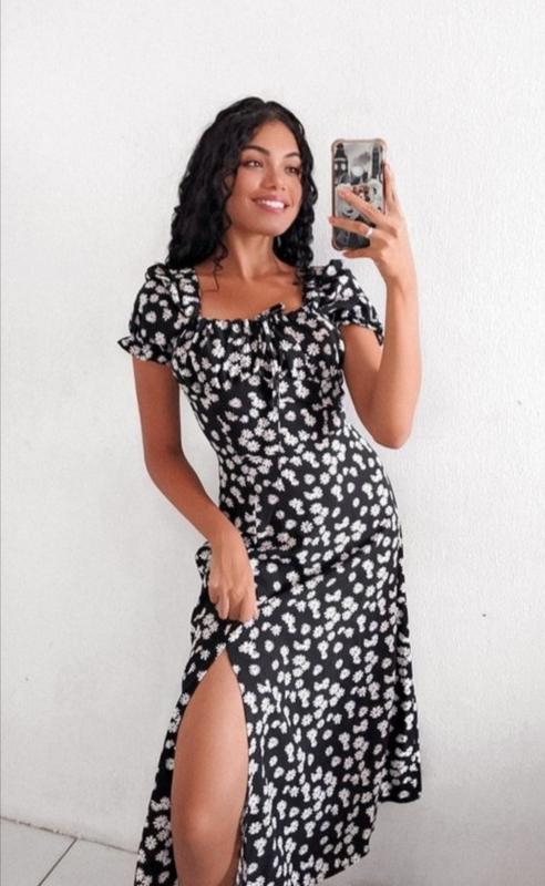 Гарне плаття міді у квітковий принт із розрізом спереду.Рукави легкі ліхтарики, на гумках.Спереду на грудях на зав'язках.Приталене, сподобається шикарно.Тканина натуральна віскоза й бавовна.Сстані нового.Розмір s,m.Заміри за бажанням.