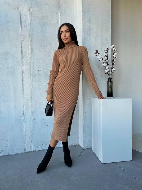 Вʼязана сукня- гольф у довжині міді😍 Модель: 117(А.О) Розмір: oversize 42/48 Подвійна вʼязка Акрил+вовна Кольори: чорний, пудра, сірий, карамель, пляшка 🎀 Сукня з високим коміром. Виріб виконаний з м’якої, приємної до тіла пряжі із вмістом вовни та акрилу. Довжина міді. Крій приталений. Довгі вузькі рукави. З боку декоративний розріз 💕 Заміри: ОГ:90/115 ОС:90/115 ДОВЖИНА РУКАВА:64 см ДОВЖИНА СУКНІ: 120 СМ (ДУЖЕ ДОБРЕ ТЯГНЕТЬСЯ)