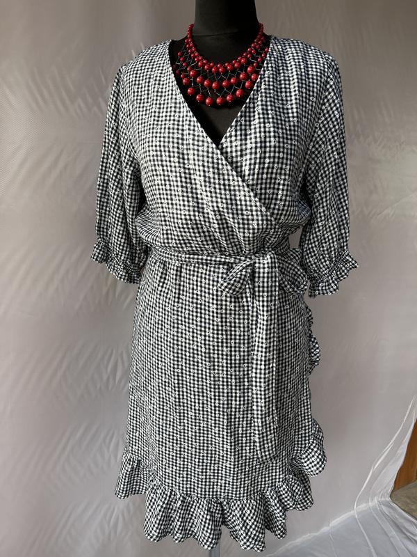 Нова сукня з натуральної тканини 55% льону/45% віскоза. По клітинці вишиті квітки. Сукня на запах. Рукав пишний ліхтарик.