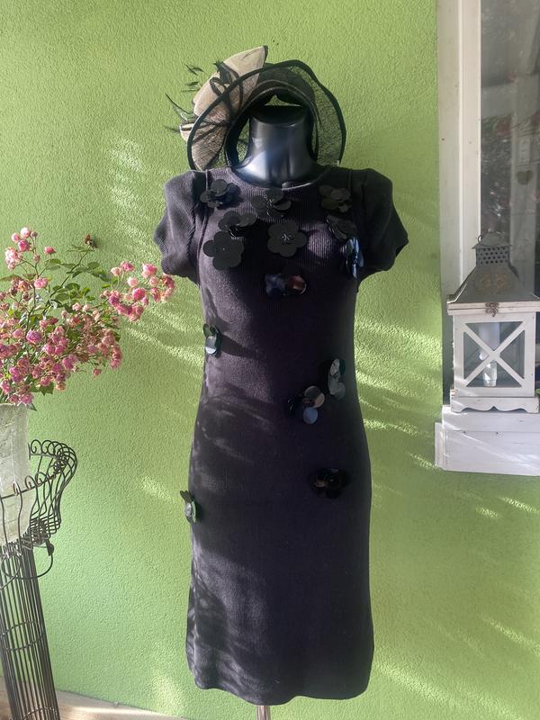 Стильна трикотажна сукня довжиною міді від Sonia Rykiel. Колір чорний. Без підкладки. Трикотажне полотно щільне, добре тримає форму. Склад:бавовна-100/. Розмір по бірці-L. Заміри:довжина-96 см, ПОГ-40 см, ПОБ-43 см. Добре тягнеться.