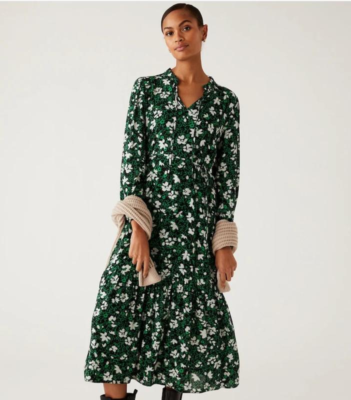 Красивое, натуральное, ярусное миди платье с карманами. Можно носить как с поясом, так и без него. 100% вискоза М&S Р. 8 Длина 117см Грудь 46см Талия 48см Бедра 54см