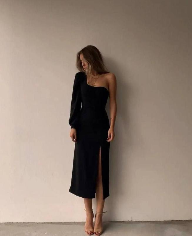 Платье черная вечерняя с вырезом миди черное платье на плечо