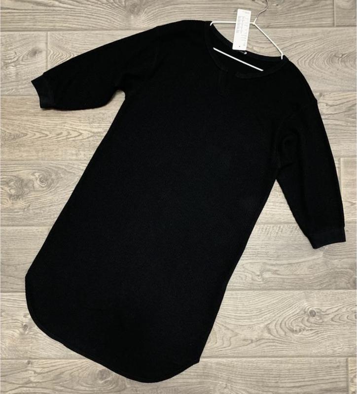 Сукня Uniqlo р. М/38/10 (підійде також на р. L/40/12). Склад: 60% котон, 40% поліестер. В наявності сукня в чорному кольорі. Тканина нетонка, фактурна - вафельна. Рукав- 3/4 (довжина від коміра -57 см). ПОГ 53 см + тягнеться ПОБ 55 см Довжина по спині 101 см К-28