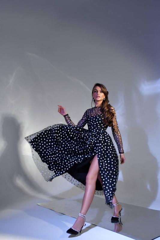 Чорна сукня-миди з голографічними блискітками Сукню прикрашає розріз збоку, що підкреслює довжину ніг. Матеріал: сітка з голографічними блискітками, софт Розмір: xs(під замовлення) Розмір: s, m Розмір: l (під замовлення +200грн)