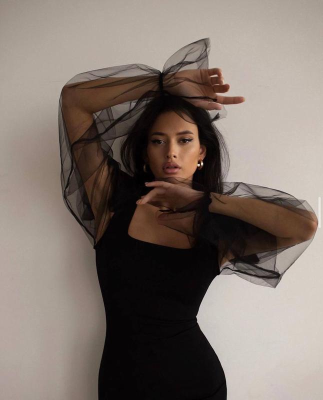 Сукня ▪️Розміри: S, M, L, XL ▪️Колір: чорний ▪️Тканина: креп дайвінг, рукава сітка однотонна Відмінна якість