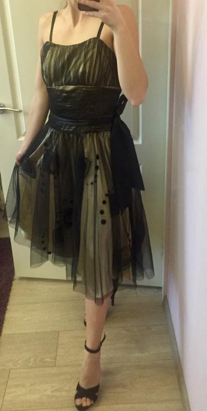 Дуже гарне, нове з етикеткою, ліф на вертикальних кісточках, знімні бретелі, верх шикарна сітка, внизу бежева позолочена тканина. Вказаний L. Можна і на M-L. Довжина від верху грудей {без брителек} 90 см + 5 см Фатин. Піт 39 потягнеться до 44 див. Пог 45 і більше там тягнеться.