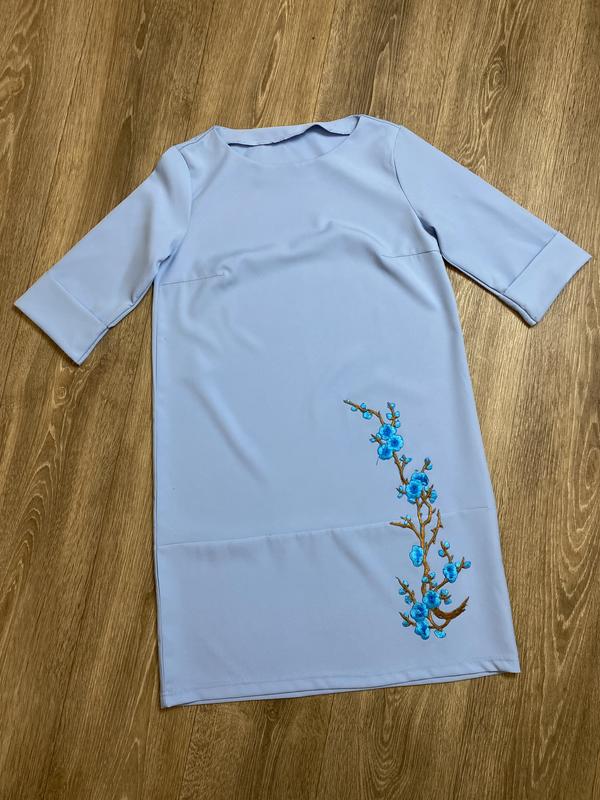 Голубое платье с вышивкой прямого кроя с четвертым рукавом. Ткань костюмная, не просвечивается. Стан нового! Размер L Рукав 37 Плече 7 Длина 90 Пог 49 Поб 53