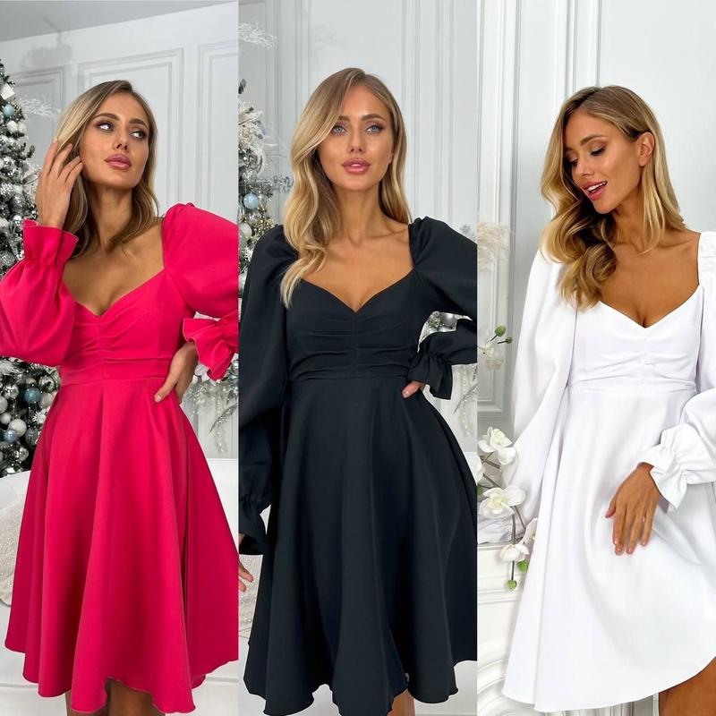 Кольори: мокко, червоний, чорний, барбі та білий Розміри: S, M, L, XL Матеріал: костюмний креп Ця сукня втілення легкості та романтизму. Модель з довгими рукавами, застібається на потайну блискавку. Рукава та плечики на резинці, у зоні декольте збірка. Відмінна якість.