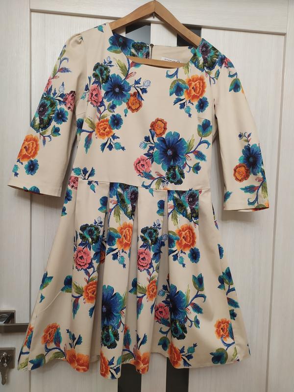 Дуже ефектне плаття, фон молочного кольору, щільне,добре тримає форму, купляли для фотосесії замість вишиванки, одягалося єдиний раз. Має такі заміри: плечі-37см, від пахви до пахви-46см, рукав-41см, талія-37см, далі вільно, спереду і позаду має по 3 внутрішні складки. Загальна довжина -82 см. Стан бездоганний,не секонд.,коштувало дорого. На третьому фото передалися кольори і фон.