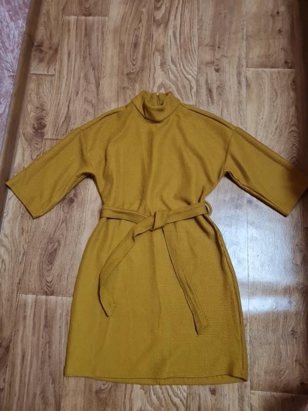 Плаття з цупкої тканини в рубчик. В коліно.Можна носити з поясом і без,комір стійкою.З заду прихована блискавка,рукав до ліктя ,можна носити як з поясом так і без.