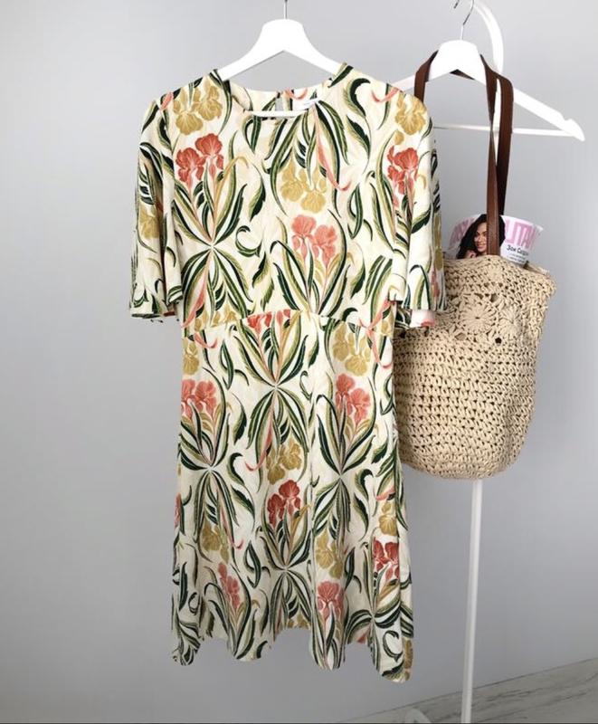 Стильна сукня від Next в квітковий принт. Добре тягнеться. Рукавчики - кльош Напівоб’єм грудей 46 (тягнеться) Напівоб‘єм талії 37 (тягнеться) Довжина 93