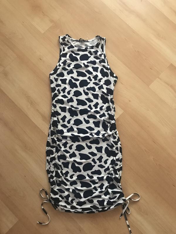 Платье очень приятного качества,по бокам можно регулировать длину ,стягивать верёвочки.подходит от M до XL.цвет темно синий с белым.