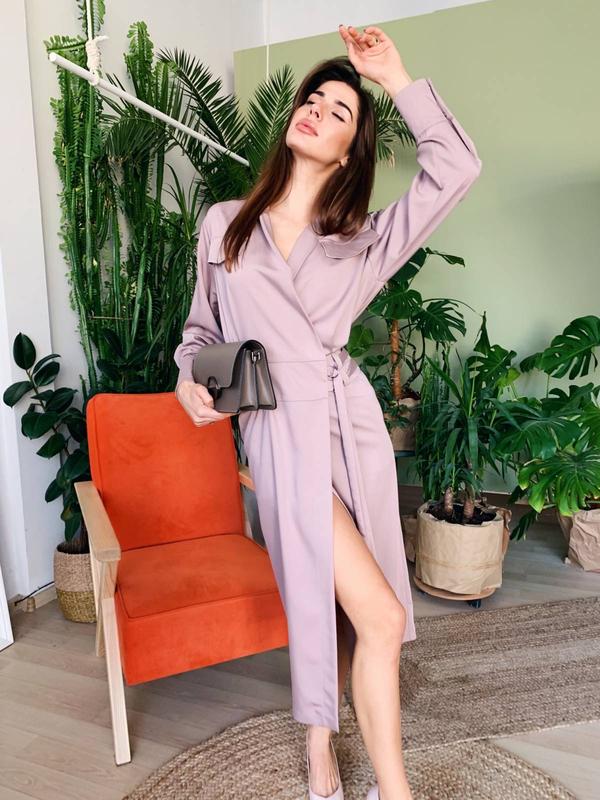 Платье пиджачного типа в длине миди (силуэт на запах), декорировано на груди накладными клапанами.