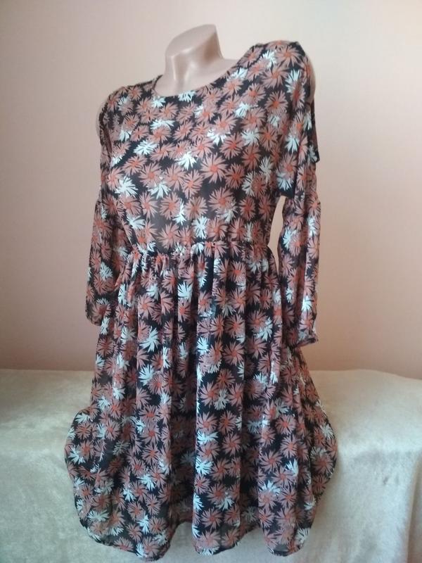 Сукня 34/36 розмір; заміри: рукав від горловини 52 см 3/4, напівобхват грудей 45 см, довжина 87 см.
