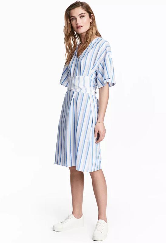 Модне плаття H&M в смужку з довгим вшитим поясом. Розмір на бірці 42. ПОГ 52,5 см Ширина по низу 64 см Довжина 104 см Склад: 61% віскоза, 31% поліестр