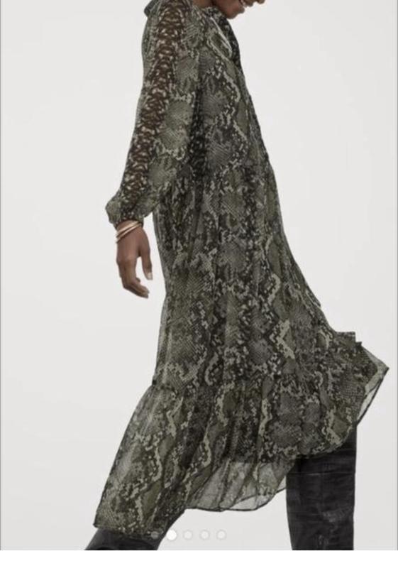 Довга сукня H&M з легкого повітряного жатого шифону з набивним малюнком. На сукні вузький комір стійка та застібка зверху. Довгі рукави із обтягнутою гумкою знизу. Відрізна талія зі складанням і спідниця з воланом. Нижня трикотажна сукня з трикутним вирізом, на вузьких бретелях, що регулюються. При бажанні можна доповнити сукню поясом, а Ваш образ буде вже іншим, але, як і раніше, чарівним. Ви будете відчувати себе вільно, впевнено у собі скрізь, у будь-якій ситуації. Як вільне підійде вагітним дівчатам. Розмір 42 Довжина 133 см, плечі 41, рукав 63 см під пахвами 53. Талія та стегна будь-які.
