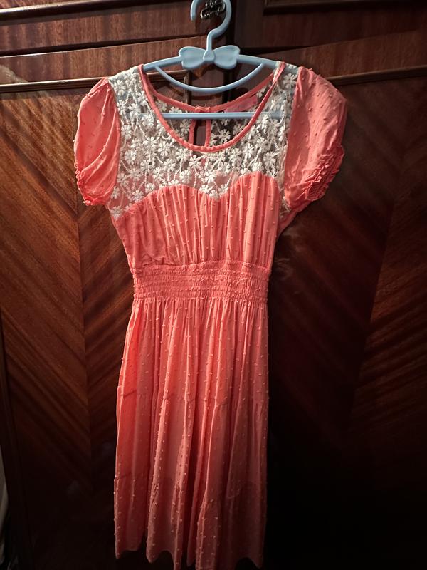 Плаття гарного рожевого кольору з білими квіточками на грудях.