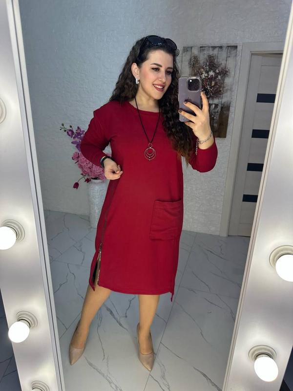Плаття Модель 5/37VL/0027 Ціна- 720грн Розміри - 46-48,50-52,54-56,58-60,62-64,66-68 Колір- чорний, бутилка , алий , шоколад, сірий Тканина- двухнитка Вільна сукня, довгий рукав, збоку зліва робоча змійка з кільцем від грудей до низу сукні; зправа збоку кишеня. Передня частина плаття трохи коротша, ніж задня. Можна носити з лосинами , кросівками, ботінками , туфлями. Прикраса входить до комплекту( фото оригінал в альбомі, кулон трохи відрізняється) Параметри зовнішнього шва виробу : 46-48: ОГ107, ОТ107, ОС107, рукав від шва 53см, довжина спереду 102, довжина ззаду 110см; 50-52: ОГ115, ОТ115, ОС115, рукав від шва 54см, довжина спереду 103см, довжина ззаду 112см ; 54-56: ОГ123, ОТ123, ОС123, рукав від шва 55, довжина спереду 105см, довжина ззаду 114см; 58-60: ОГ131, ОТ131, ОС131, рукав від шва 56см, довжина спереду 108, довжина ззаду 116см ; 62-64: ОГ140, ОТ140, ОС140, рукав від шва 57, довжина спереду 110, довжина ззаду 118см; 66-68: ОГ146, ОТ146, ОС146, рукав від шва 57см, довжина ззаду 120см. 🔥 НАКЛАДЕНИЙ ПЛАТІЖ ПО ПЕРЕДОПЛАТІ 150-200 грн і ЛИШЕ НОВОЮ ПОШТОЮ❗️❗️❗️❗️ ☝️Відправки 4 рази на тиждень . ▪️- Нова пошта відправки 4 рази на тиждень. ▪️- Укр пошта 2 -3 рази на тиждень ( доплата за пакування від 15 до 35 грн в залежності від об'єму) ◼️Термін відправки товару 1-5 днів. 💲Оплата: ◼️ Оплата повна на картку ⬛️ НАЛОЖКА по ПЕРЕДОПЛАТІ 200 грн за 1 річ. За дві речі передоплата 300 грн. 🔔Якщо клієнт не прийшов на пошту, або відмовився від посилки- передоплата не повертається🔺🔺🔺 По наложкам всі питання вирішуються на пошті. Огляд на брак,колір і тд. ✅ Стосовно обміну і повернення кожна позиція обговорюється окремо
